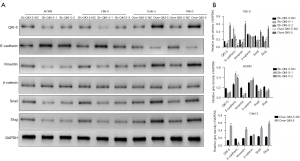 Western blot analysis was performed according to the previous report. Briefly, total proteins from 786-O, ACHN, and Caki-2 cells or tumor tissues were extracted using RIPA Lysis buffer (E-BC-R327, Elabscience, Houston, TX, USA) and then the protein concentration was measured using a bicinchoninic acid (BCA) protein assay kit. For western blot, 20 g of protein with protein loading buffer were boiled at 100 °C for 10 min for each sample, followed by separation in 10–12% sodium dodecyl sulphate-polyacrylamide gel electrophoresis (SDS-PAGE). Then, 5% lipid-free milk buffer were used to block the membranes with blots for 2 h at room temperature after transferring onto polyvinylidene fluoride (PVDF) membranes (Millipore, Billerica, MA, USA), incubated with primary antibody against QKI-5 (ab126742, 1:2,000, Abcam, Cambridge, United Kingdom), E-cadherin (ab40772, 1:1,000, Abcam), vimentin (ab92547, 1:1,000, Abcam, Cambridge, United Kingdom), β-catenin (ab32572, 1:2,000, Abcam, Cambridge, United Kingdom), SNAIL (ab216347, 1:1,000, Abcam, Cambridge, United Kingdom), SLUG (ab51772, 1:1,000, Abcam), and GAPDH (1:2,000, Rabbit polyclonal, Abcam, Cambridge, United Kingdom) overnight at 4 °C. Finally, protein signals were detected using enhanced chemiluminescence (ECL) reagent (Thermo Scientific, Waltham, MA, USA) based on the manufacturer’s instructions. After incubation with secondary antibody anti-mouse immunoglobulin (IgG, ab205719, 1:20,000, Abcam, Cambridge, UK) for 2–3 hours.