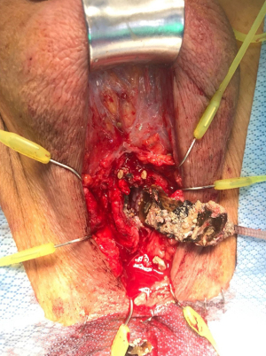 The second patient is an 85-year-old man with SUI following radical retropubic prostatectomy. Fifteen years prior to presentation, he had an AUS placed following a failed urethral sling. Upon presentation, he remained disease free and pelvic radiation naïve. He presented with a scrotal and right groin abscess, and worsening incontinence. He had been taken to the operating room at an outside facility for an unsuccessful AUS explant due to the inflammation and calcifications around the cuff. Urethroscopy at that time reported a severely eroded urethra and stone formation on the cuff, filling almost the entire urethral lumen and preventing urethral catheter placement.