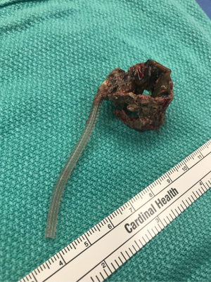 After administering intravenous antibiotics, he underwent explantation of the AUS cuff and drainage of the right groin abscess. A perineal incision was made and dissection continued to the urethra. The cuff was noted be completely within the urethral lumen. The urethra was mobilized and a dorsal midline vertical urethrotomy was performed to remove the cuff and surrounding calcification (Figures 1,2). Due to the extensive fibrotic reaction surrounding the corpus spongiosum, the prior sling was not visualized. The scarred urethra in the midline was excised. A primary closure with mucosal advancement was performed to preserve the urethral lumen diameter. A #20 French urethral catheter was maintained for ten days postoperatively. The patient is scheduled for a cystoscopy and will undergo an AUS placement eight months after device explantation. Informed consent was obtained from each patient for publication of the de-identified information presented in this case report. All procedures performed in this study were in accordance with the ethical standards of the institutional and/or national research committee(s) and with the Helsinki Declaration (as revised in 2013). Written informed consent was obtained from the patient for publication of this case report and accompanying images. A copy of the written consent is available for review by the editorial office of this journal.
