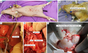 To ensure success in establishing a low weight miniature porcine kidney transplantation model, we have identified several critical steps in our protocol to minimize complications. First, we found in previous mice/rat kidney transplantation models that the renal arteries and veins were so thin that end-to-end anastomoses would result in a higher probability of anastomotic stenosis and thrombosis. To remedy this situation, we included a patch of either the aorta and IVC vessel wall as a patch graft at the time of kidney graft retrieval. This modification allowed us to maximize the length of vessels and avoid damage to the graft artery. Budgeon et al. reported that a carrel patch technique could reduce the risk of thrombosis and leakage by displacing the suture line away from the entrance to the renal artery (19). Carrel et al. and Mazzucchi et al. also arrived at a similar conclusion (20,21).