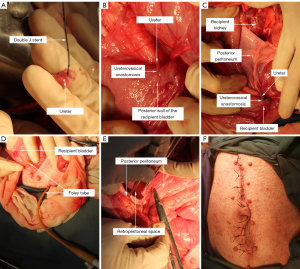 In the models reported previously, the donor pigs typically weighed 30–35 kg. With smaller pigs, the traditional end-to-end technique of vessel anastomosis might not be suitable because of the small vessel diameter and the end-to-end or side-to-side anastomosis method of ureterovesical anastomosis might be challenging and result in stricture.